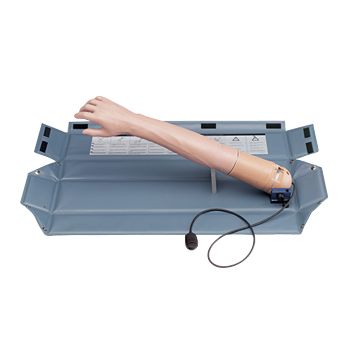 The Ambu IV Trainer is a high-quality, realistic training tool designed for effective intravenous access practice. It features three veins and one artery, with a manually simulated radial pulse for lifelike feedback. Made with natural latex, the replaceable skin and veins offer self-sealing properties to extend the arm's usability. The movable wrist and rotating arm enhance realism, especially for catheter placement on the hand. A built-in fluid reservoir eliminates the need for external tanks, and the internal valve system minimizes air pockets. The included multi-purpose case functions as both a protective carrying case and a washable training surface with an infusion stand mount. An integrated indicator panel provides immediate feedback on correct vascular access.