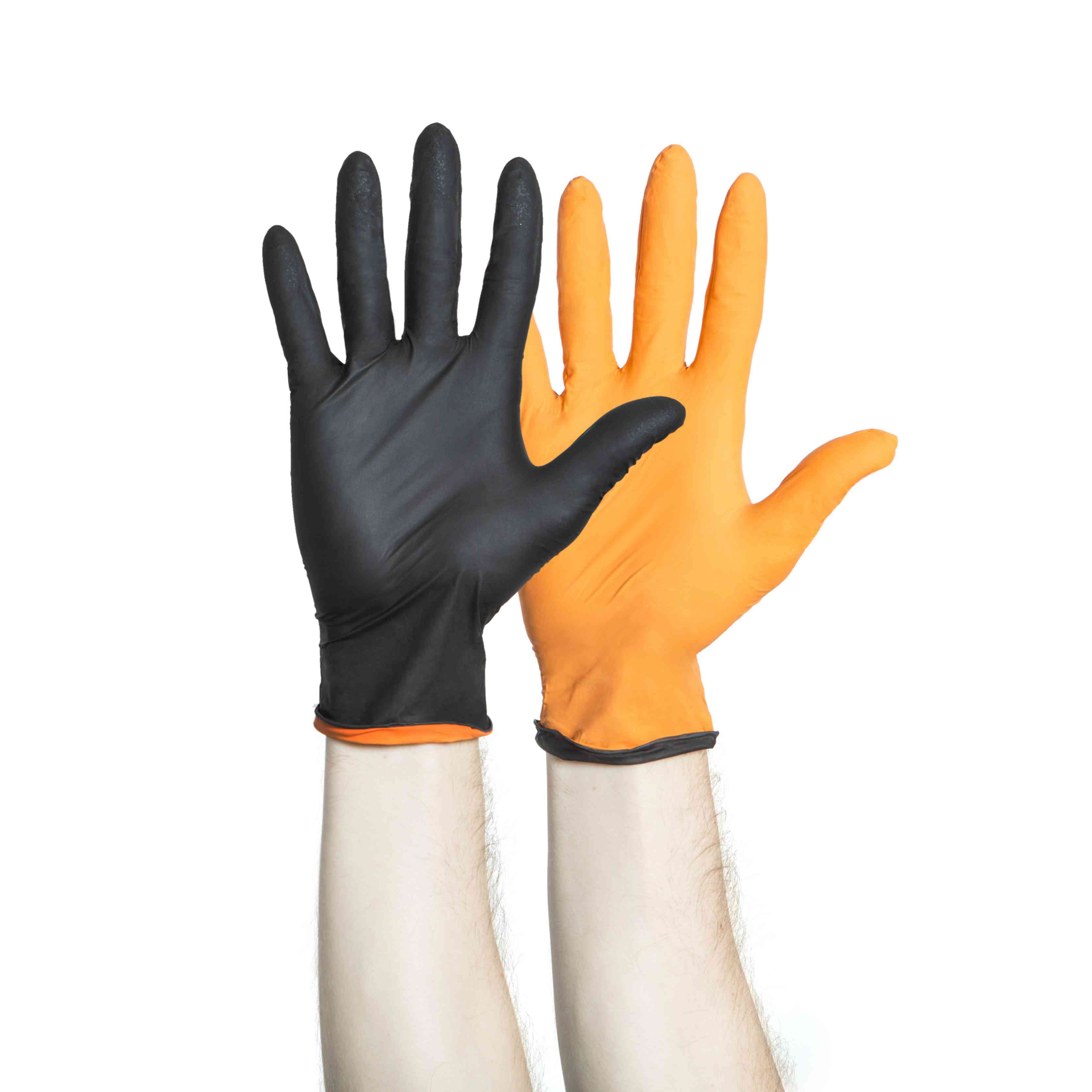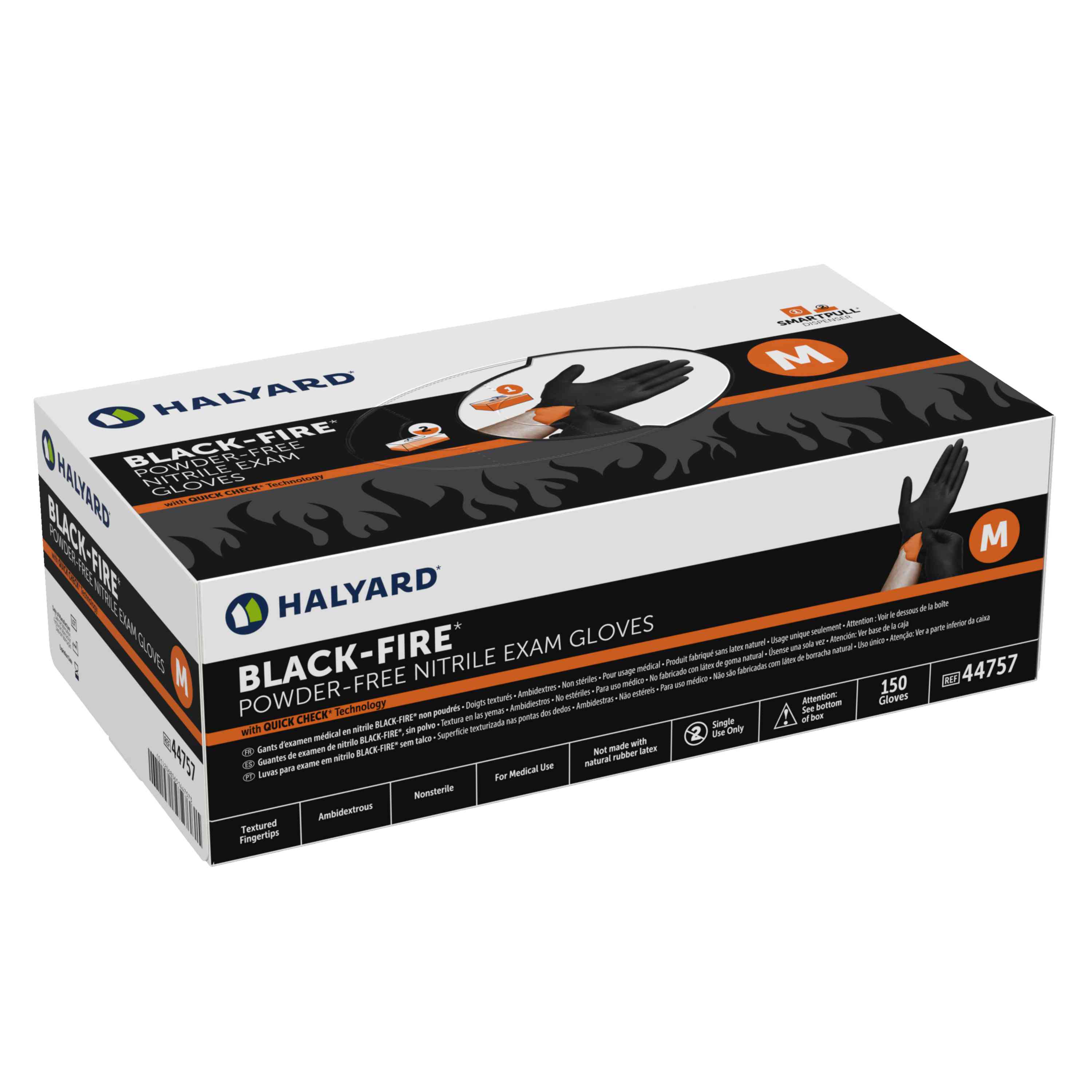 With proprietary QUICK CHECK breach detection technologyBLACK-FIRE*nitrile exam gloves offer the unique ability to detect rips and tears by revealing a high-visibility orange inner layer through the breach. These dual-purpose gloves can also be reversed and worn with the bright orange side out in situations that call for high-visibility. Sold as a case of 10 boxes with 150 gloves per box.