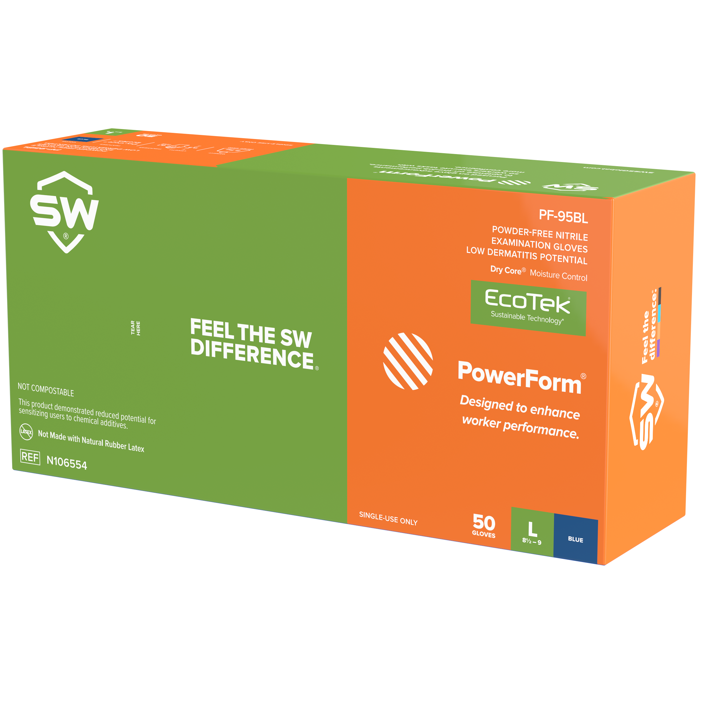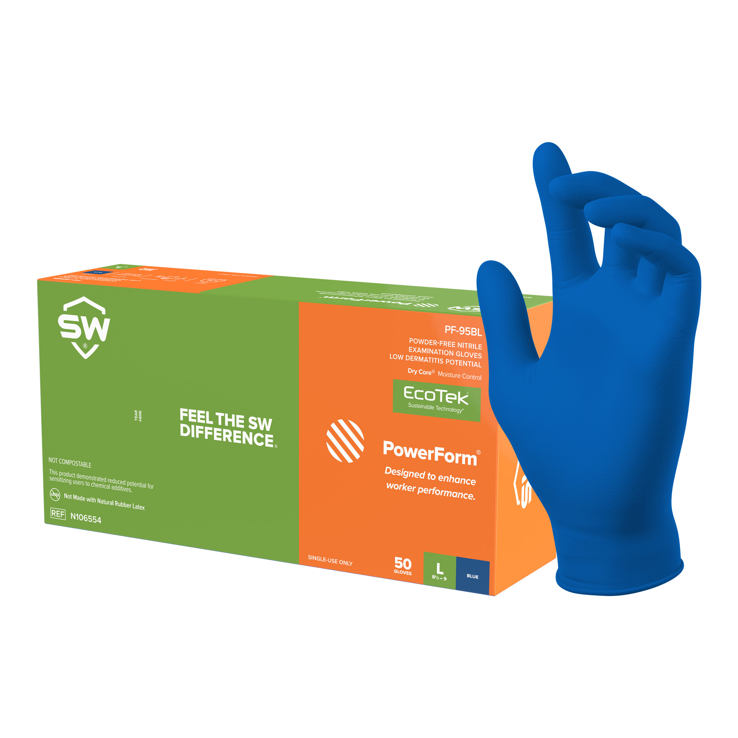 The PF-95BL Nitrile Exam Gloves are designed to keep hands cool, dry, and comfortable during extended use. Featuring Dry Core moisture management technology, these gloves wick away sweat to reduce discomfort and improve grip control in demanding environments. Built with EcoTek sustainable materials, they deliver dependable strength and performance while minimizing environmental impact. The fully textured surface ensures excellent grip in wet or oily conditions, and the ANSI Level 3 abrasion rating adds durability for challenging tasks.