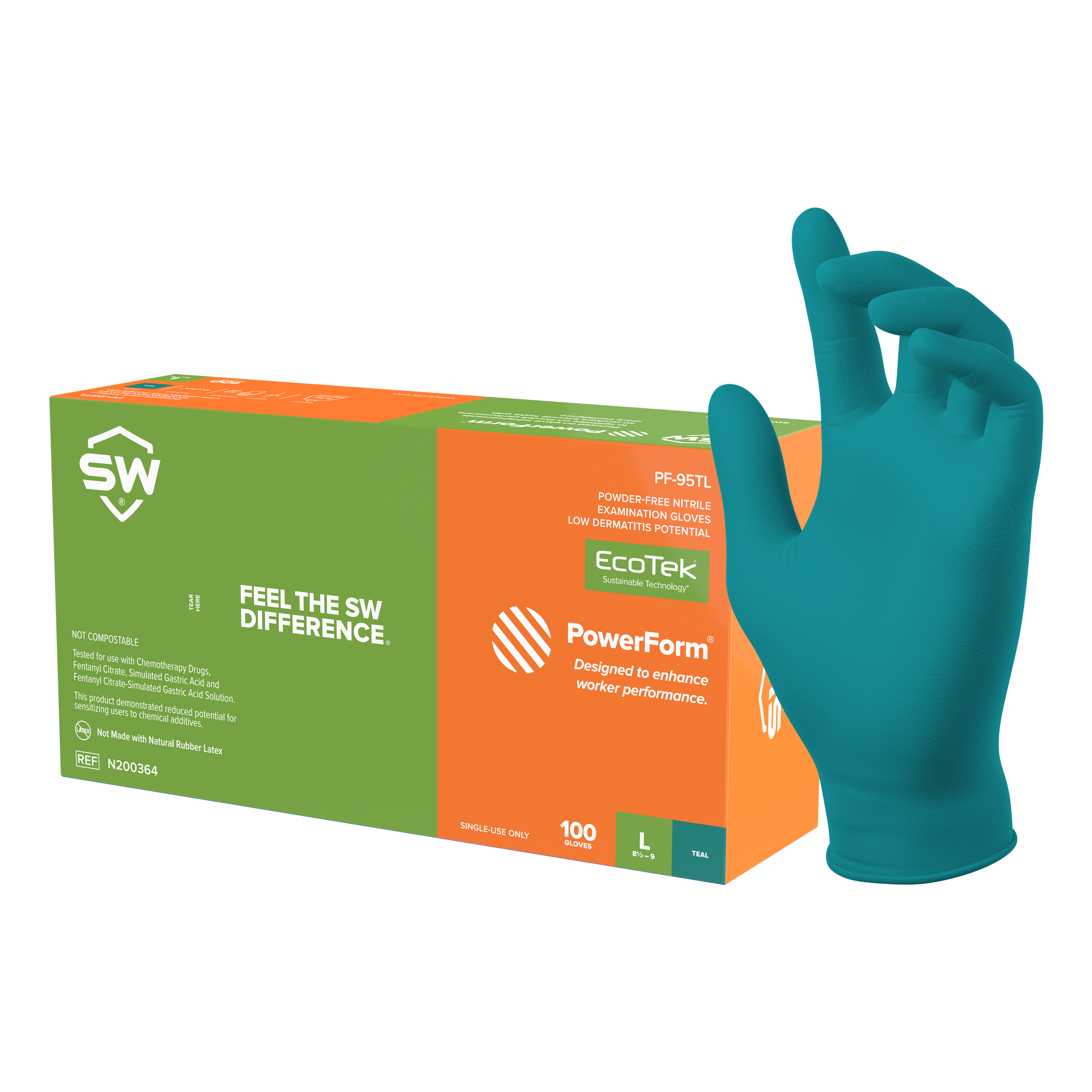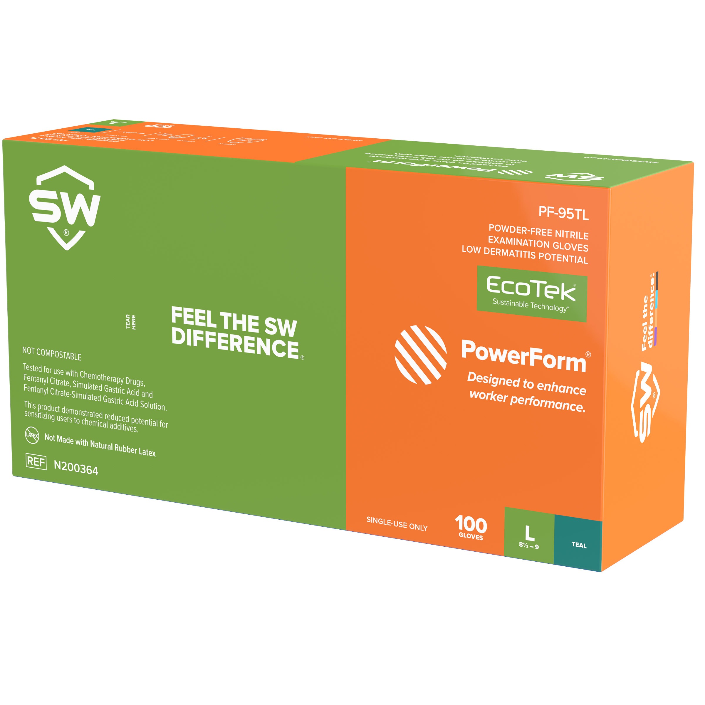 The PF-95TL Pack-Rite Nitrile Exam Gloves deliver a balance of comfort, durability, and performance for professionals who demand dependable hand protection. These 5 mil single-use gloves are engineered for control and precision, featuring a finger-textured surface for reliable grip in both wet and dry conditions. The EcoTek sustainable design supports environmental responsibility without compromising quality or strength. Each glove maintains consistent thickness from tip to cuff, ensuring comfort, tactile sensitivity, and easy donning with a tear-resistant beaded cuff.
